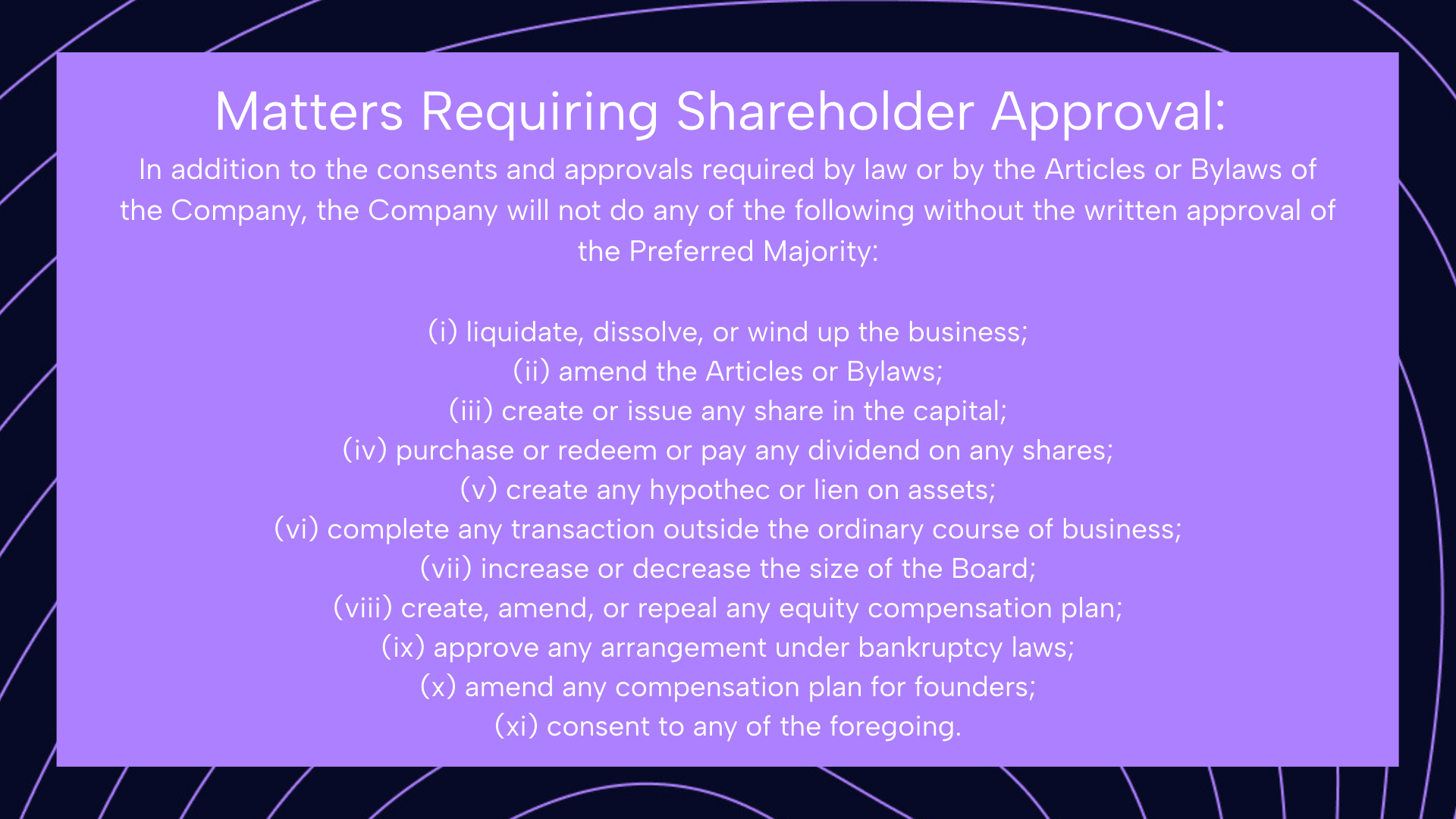 Essentiellement, une majorité spéciale des actionnaires privilégiés (typiquement 66 ⅔% des actions privilégiées) doit approuver toutes ces décisions majeures.