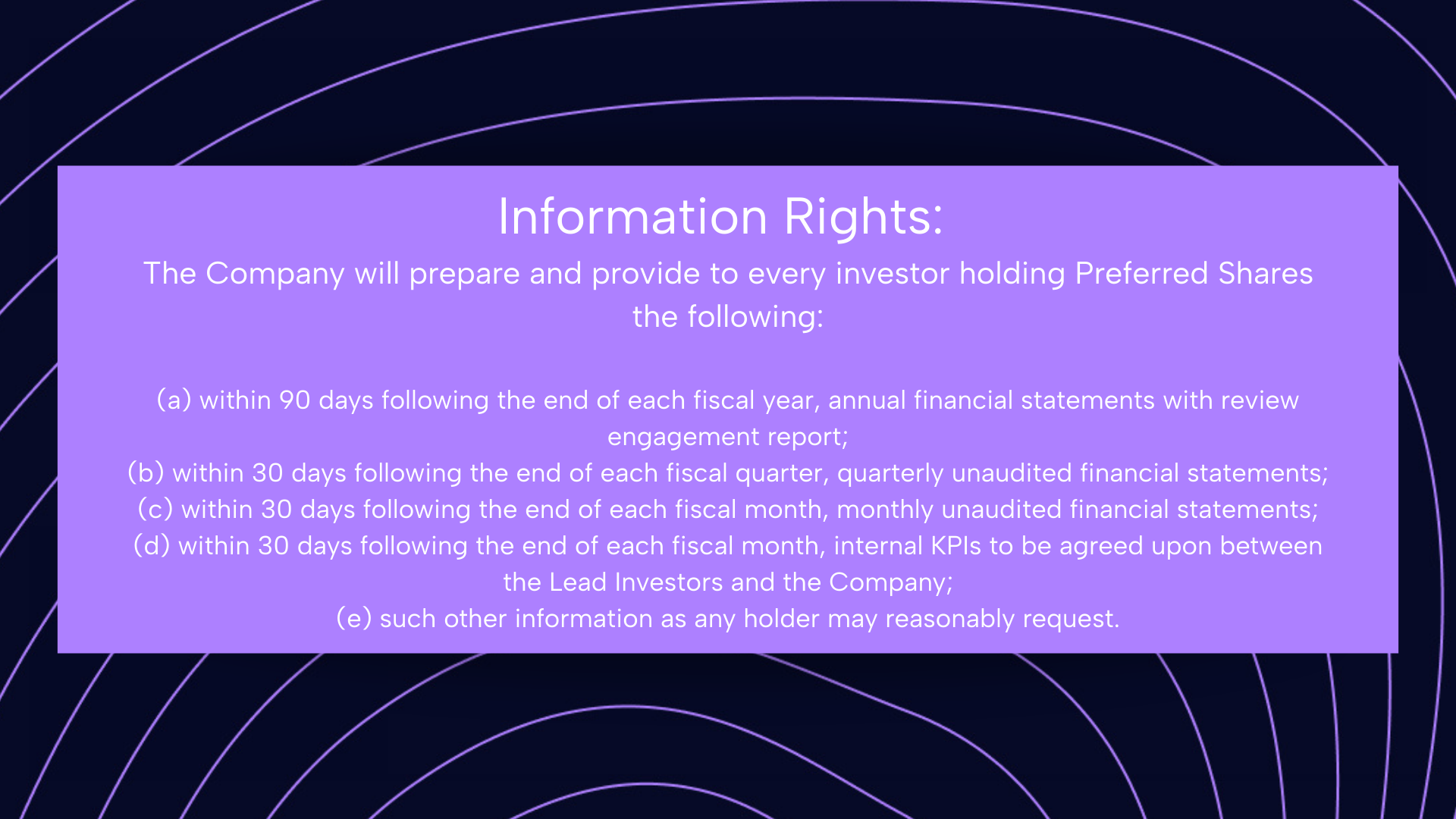 En gros : tu dois envoyer tes états financiers et tes KPIs régulièrement à tes investisseurs.