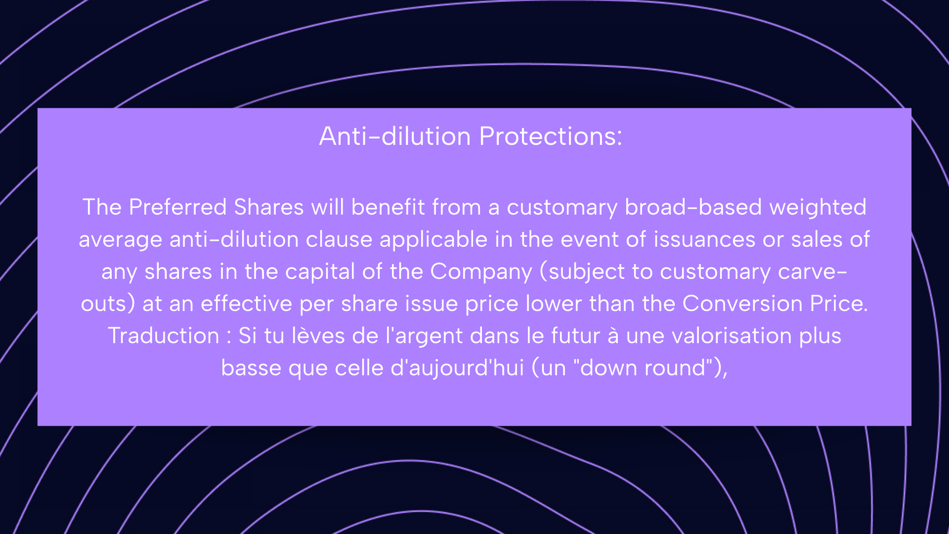 Traduction : Si tu lèves de l'argent dans le futur à une valorisation plus basse que celle d'aujourd'hui (un "down round"), les investisseurs actuels sont protégés en partie contre la dilution.